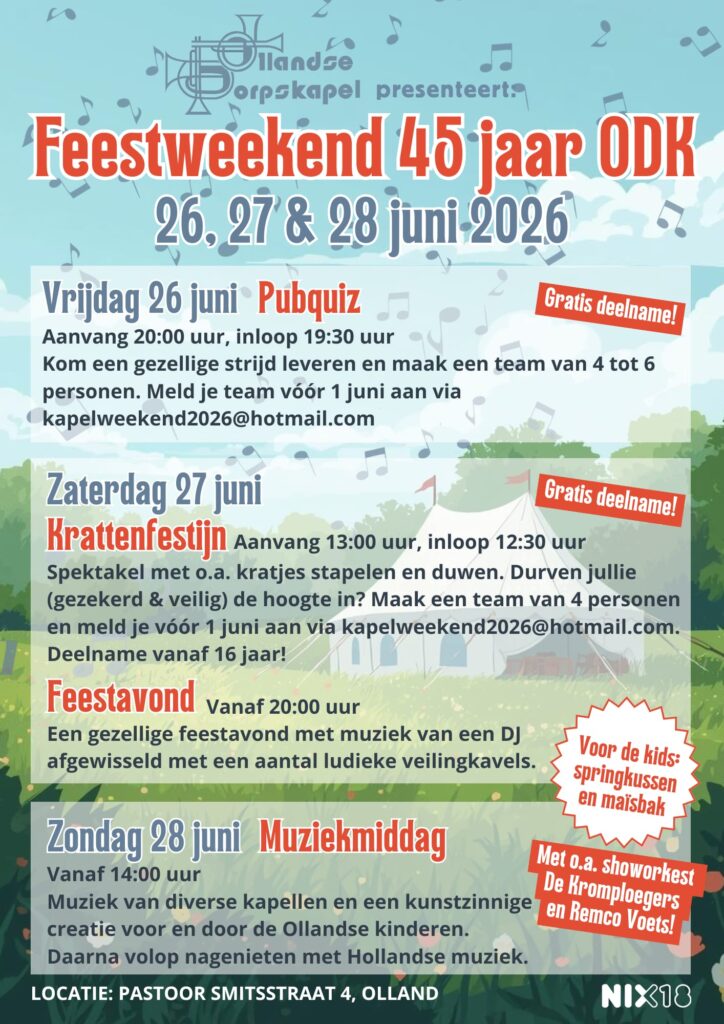 Op zondag is er een muziekmiddag met leuke kapellen en een optreden van Remco Voets. We sluiten het feest af met Hollandse muziek. Hiervoor is aanmelden uiteraard niet nodig, gewoon zoveel mogelijk van de gezelligheid komen genieten.